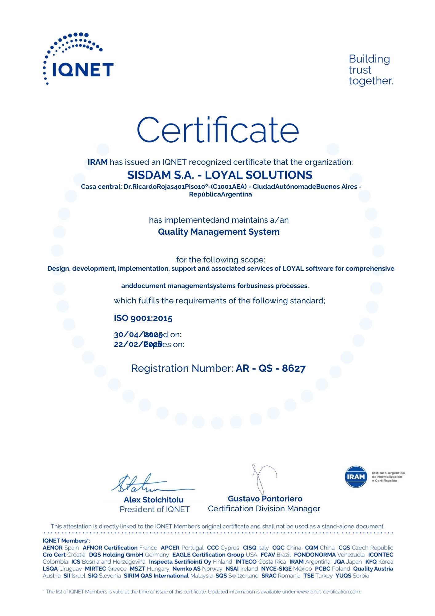 Nos orientamos al cumplimiento de los requisitos y la mejora continua de la eficacia del sistema de gestión de la calidad y seguridad de la información, determinados en la norma IRAM ISO 9001:2015 e ISO/IEC 27001:2022.